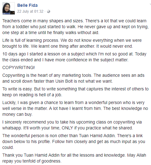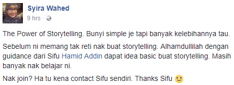 hingga anda sendiri mampu menjadi pakar storyteller seperti bekas murid saya ini (itu pun kalau anda mahu jadi seorang copywriter la)